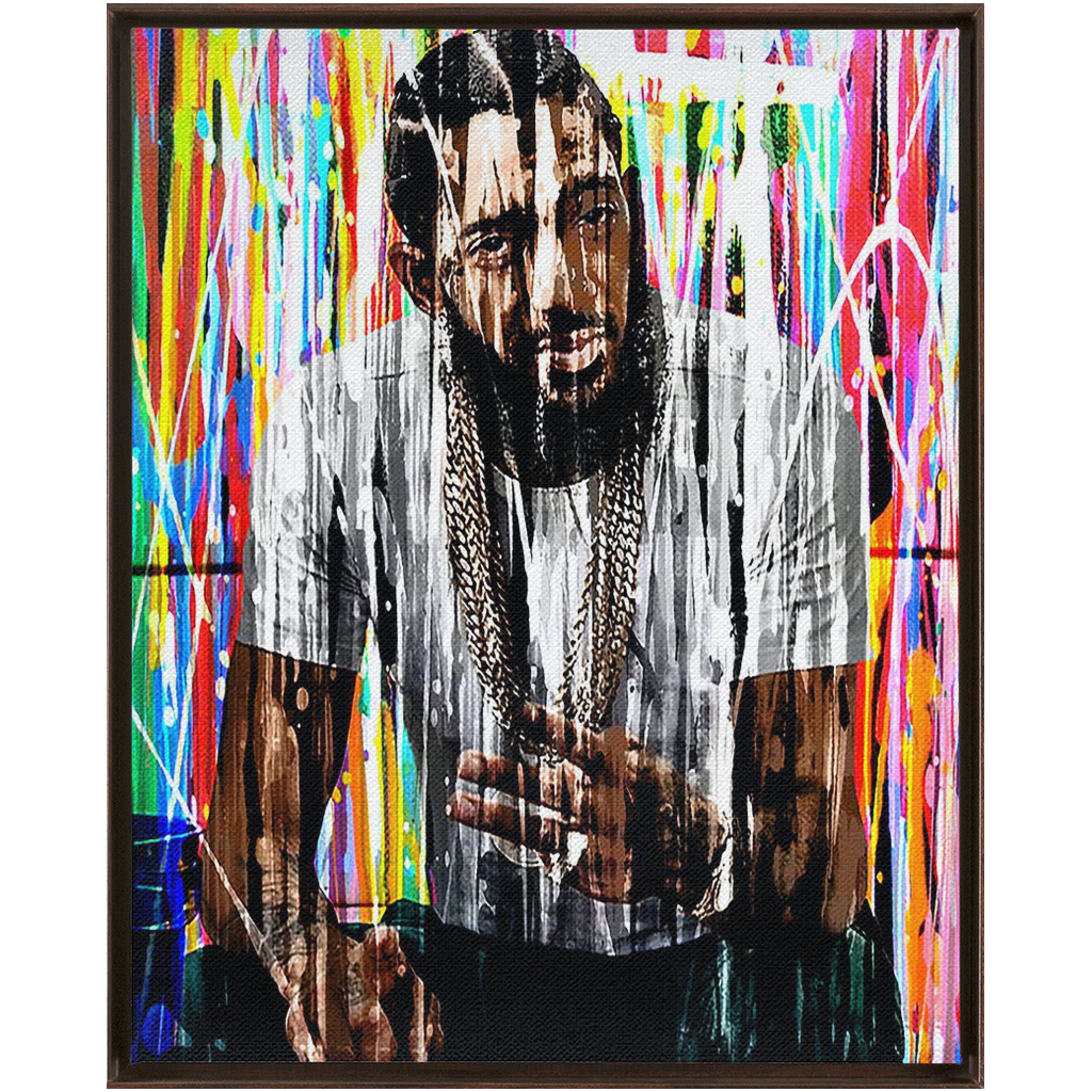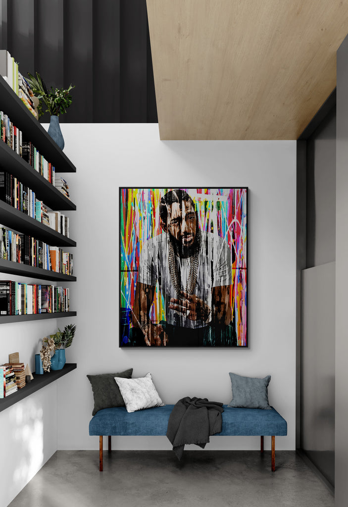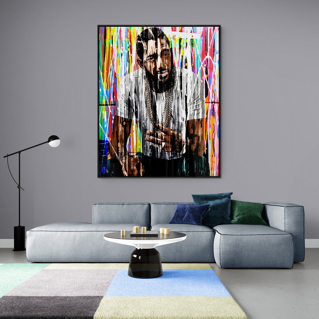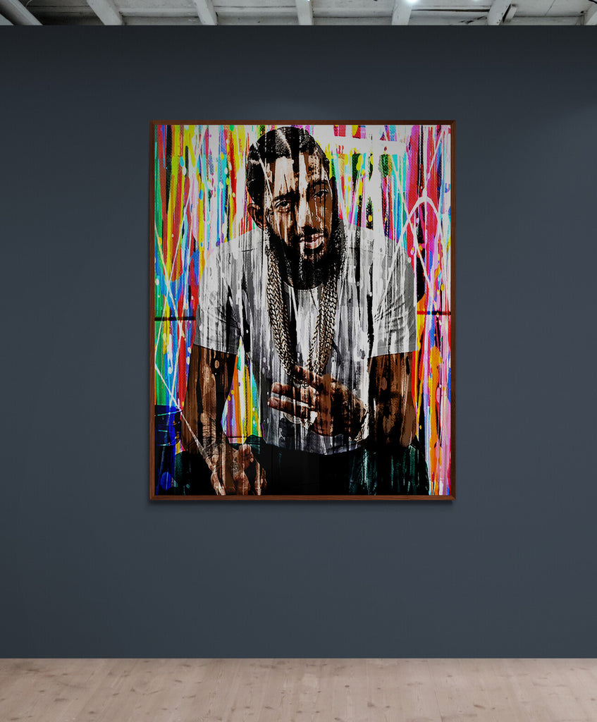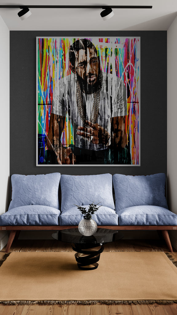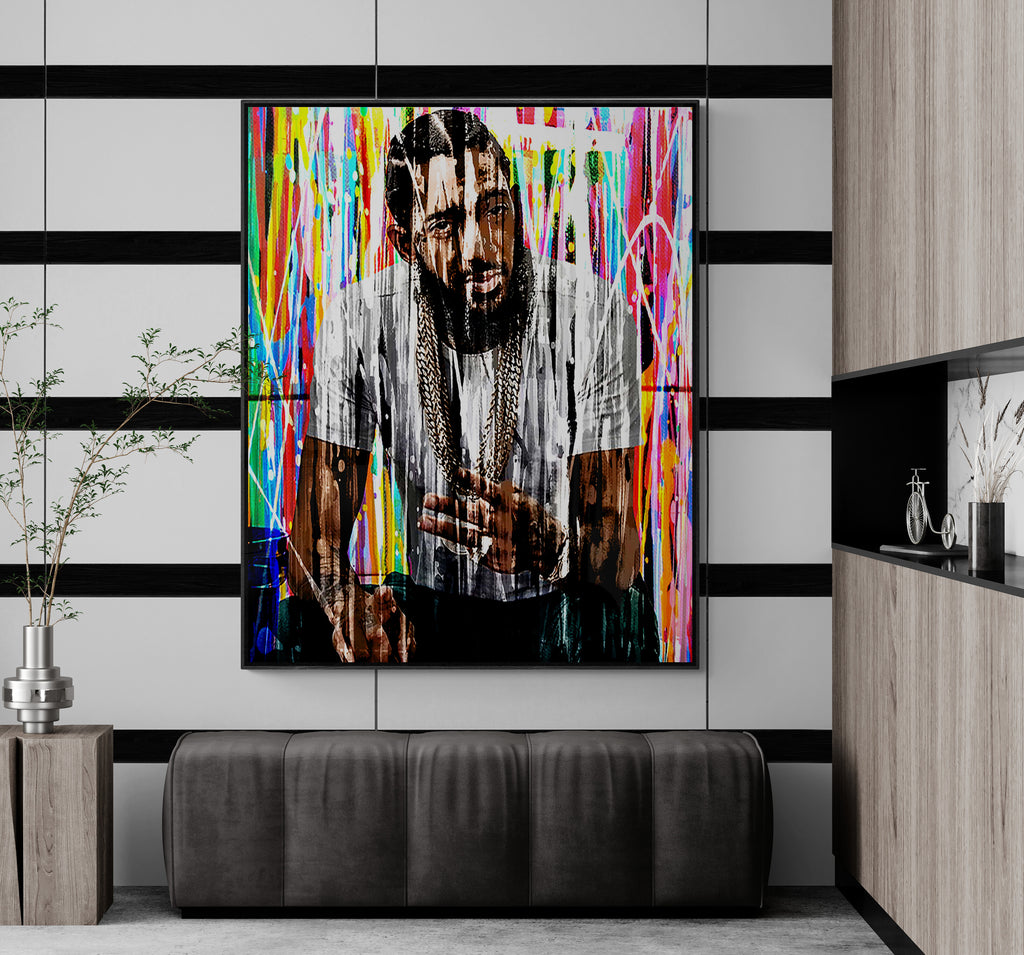 This vertical canvas piece, with its vibrant and abstract depiction of Nipsey Hussle, serves as a powerful tribute to the rap legend. The use of bold, dynamic colors and abstract forms creates a visually stunning and emotionally resonant piece of art, capturing the essence of Nipsey Hussle's spirit and legacy.
