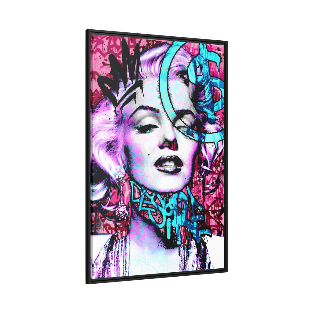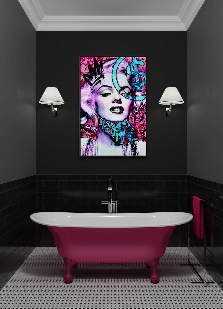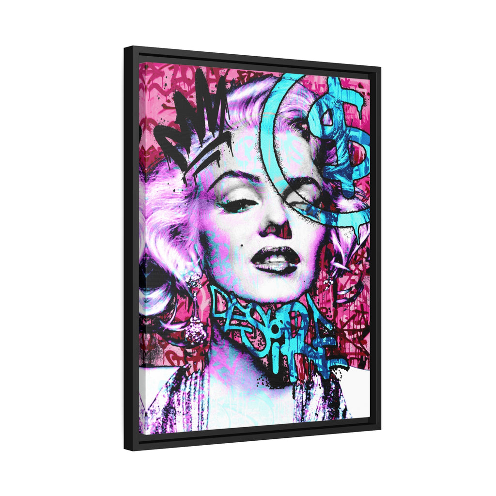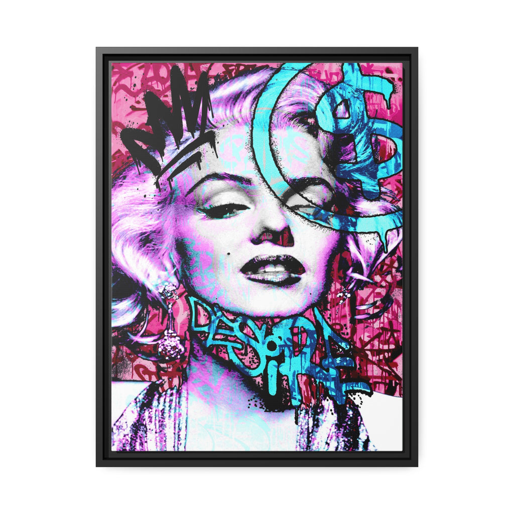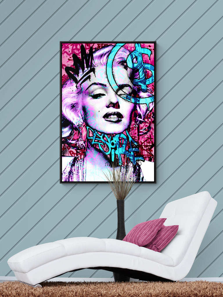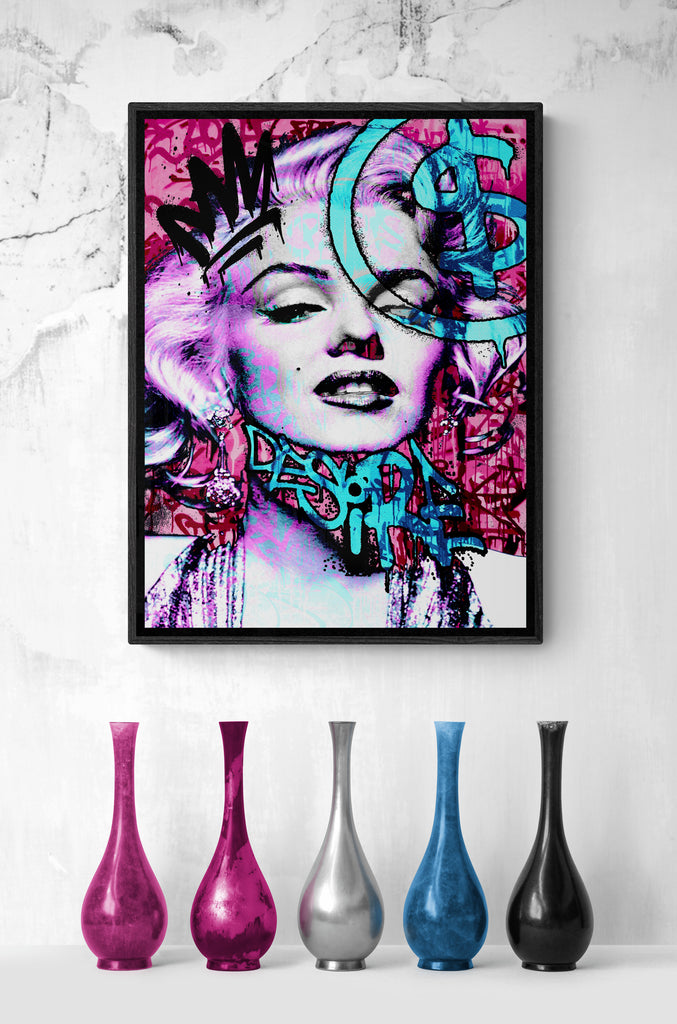 Adding a contemporary twist, graffiti-style blue lettering emerges, spelling out desire in bold, expressive strokes. This unconventional touch injects the piece with a sense of urban flair and modernity, juxtaposing the classic glamour of Marilyn with the edginess of street art.