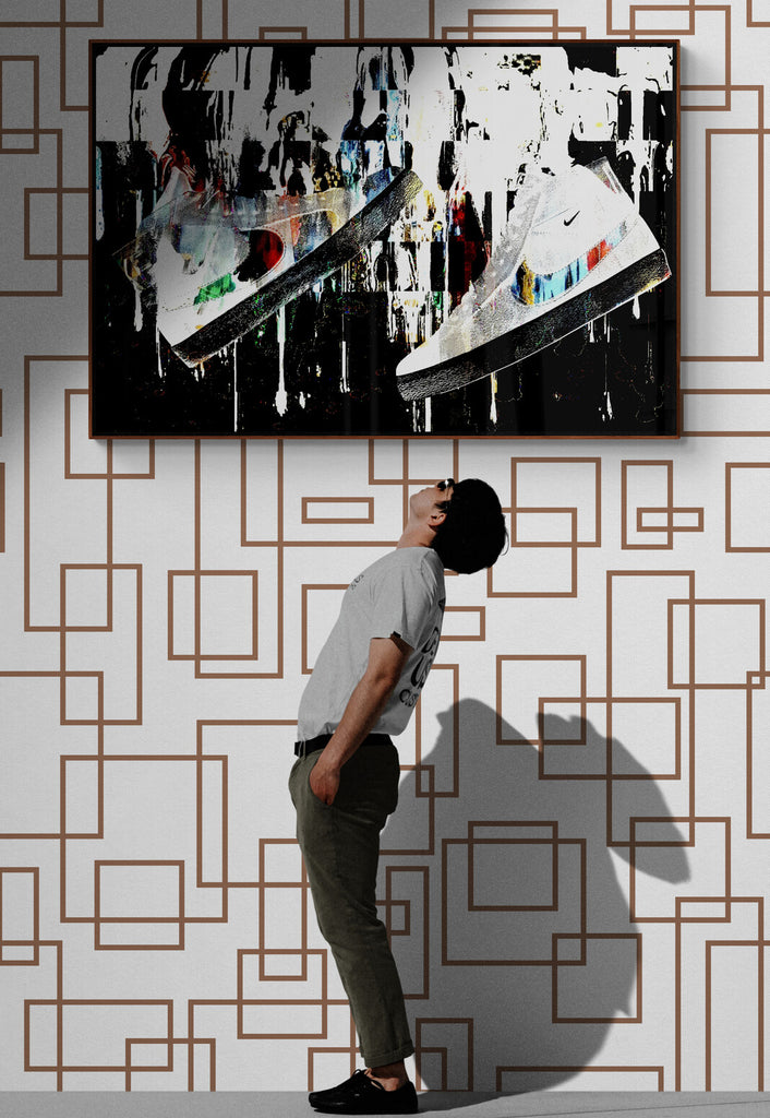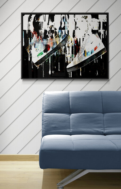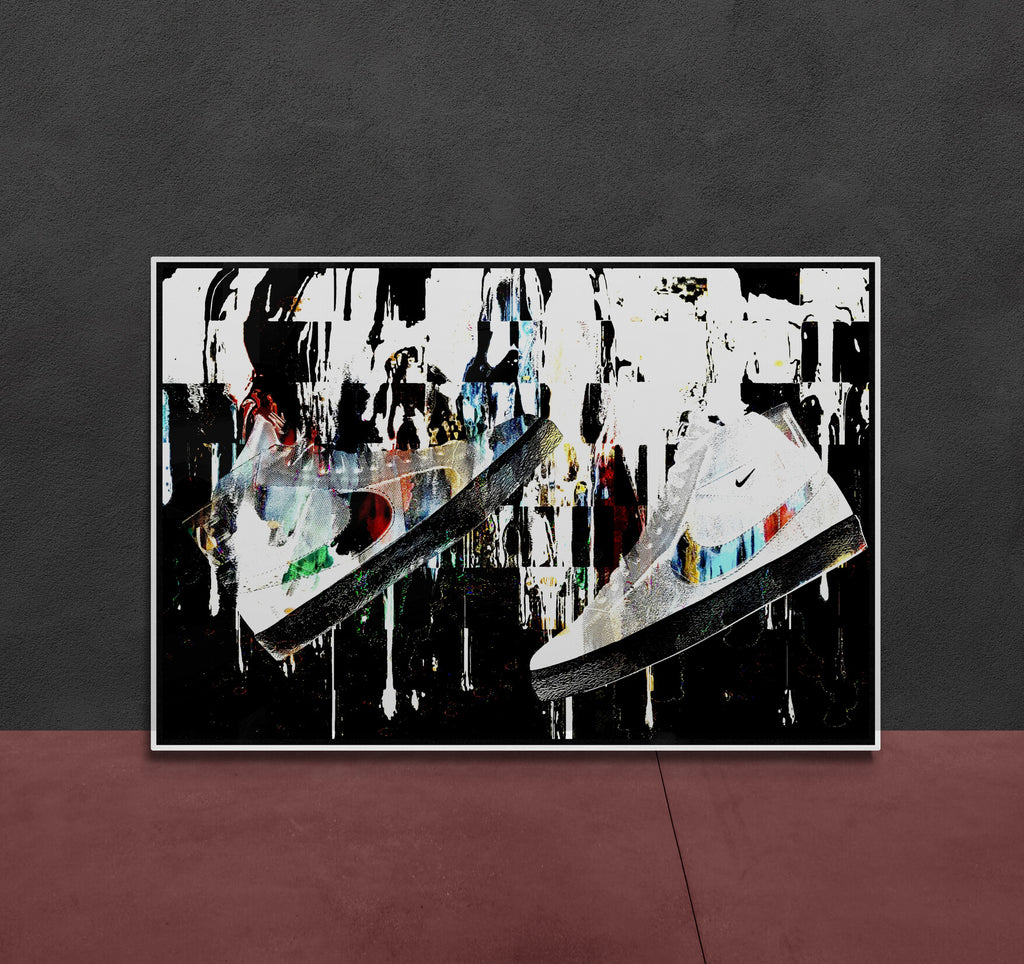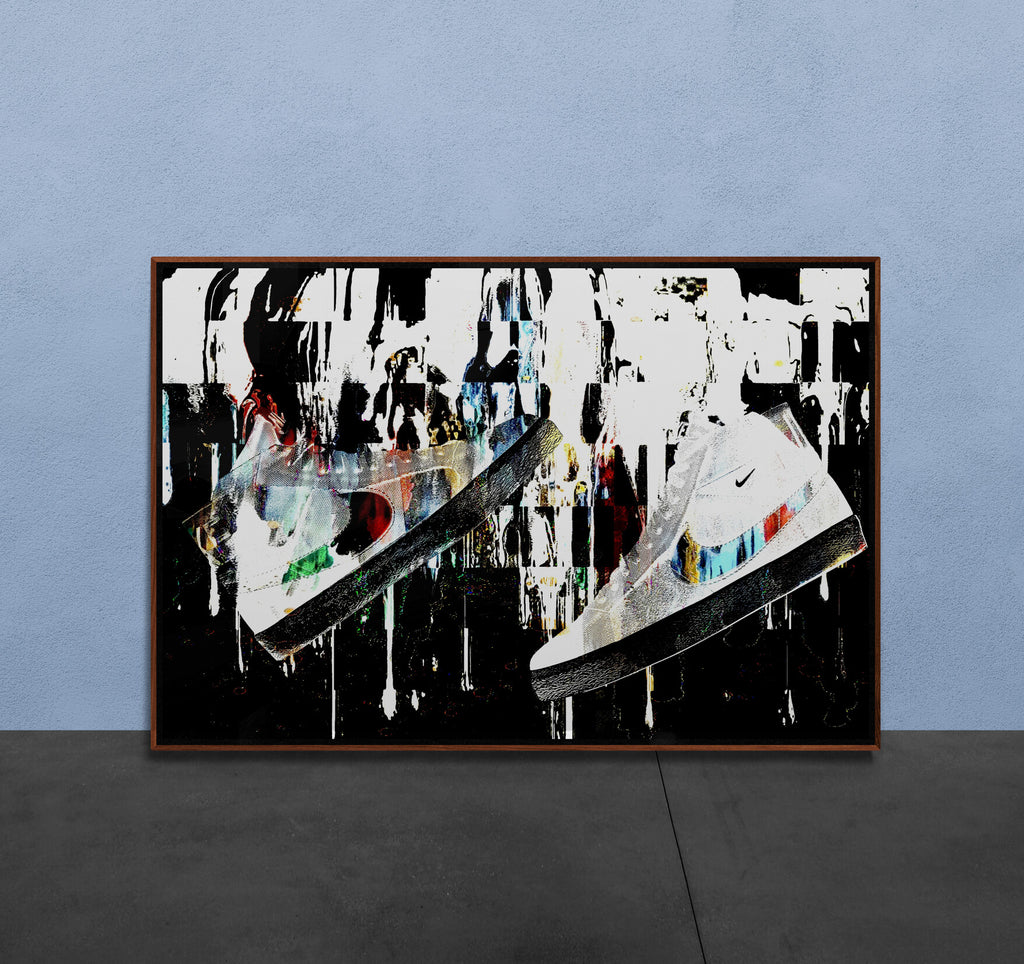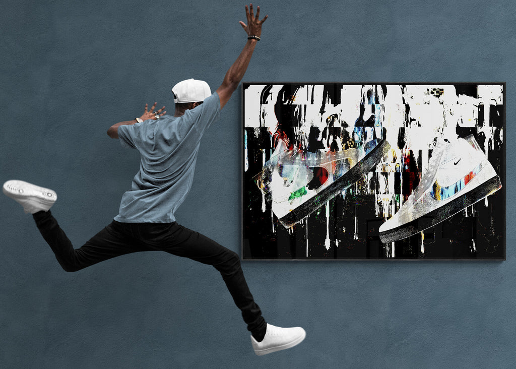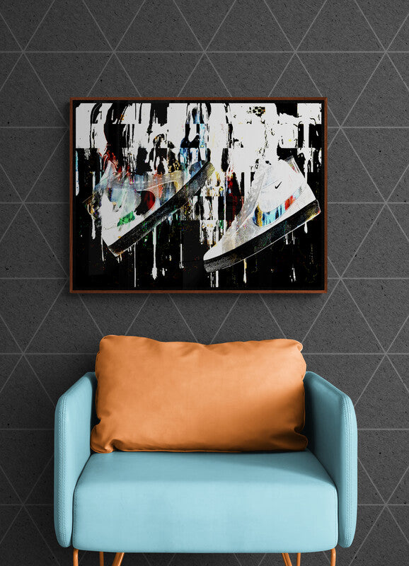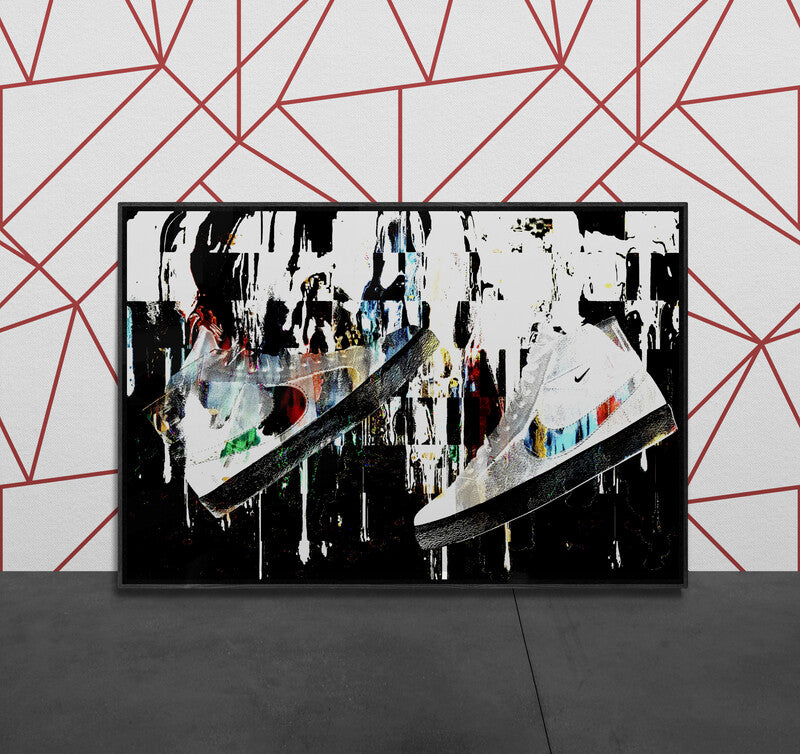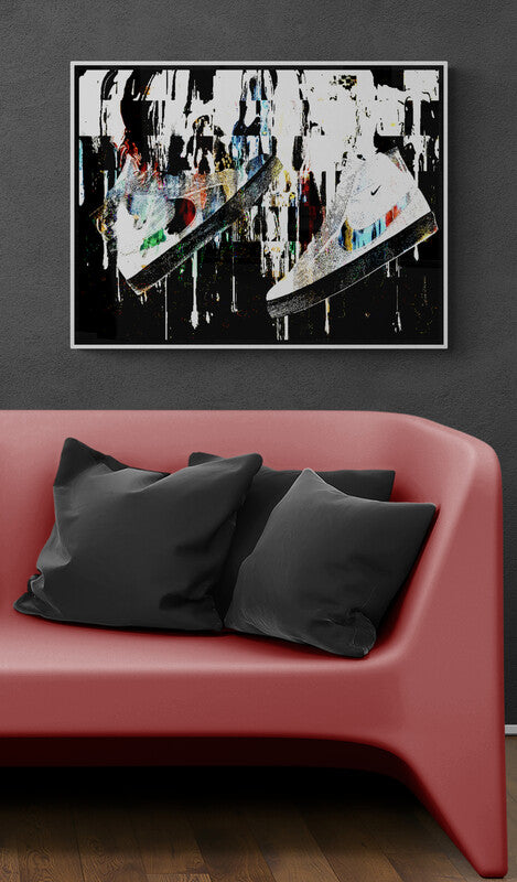 A bold fusion of movement, style, and sound, Sole Reverberation captures the raw energy of sneaker culture in motion. Suspended mid-air, the sneaker becomes more than fashion—it becomes a symbol of personal rhythm and street identity. Explosive splashes of color, layered textures, and urban-inspired composition create a visual echo, as if each step leaves behind a lasting impact. This piece speaks to the resonance of self-expression through footwear—where every sole tells a story, and every stride reverberates with attitude.