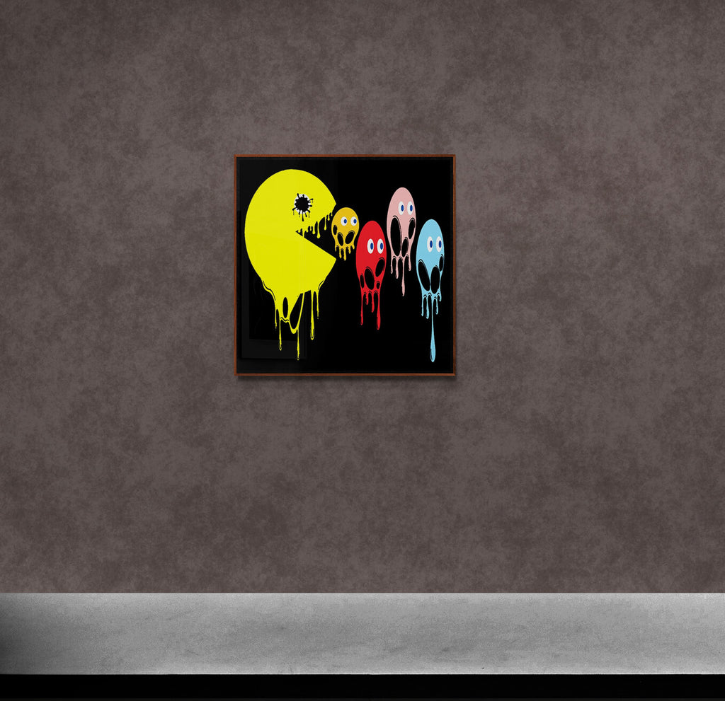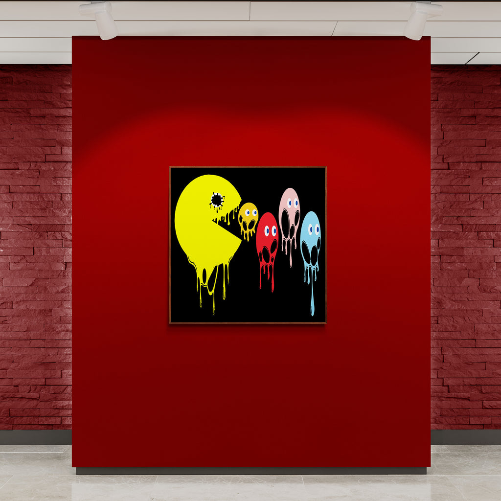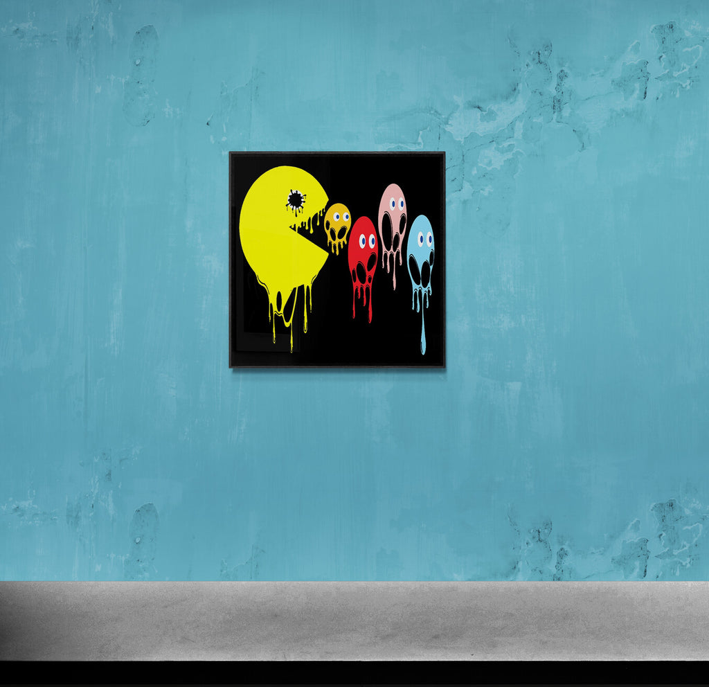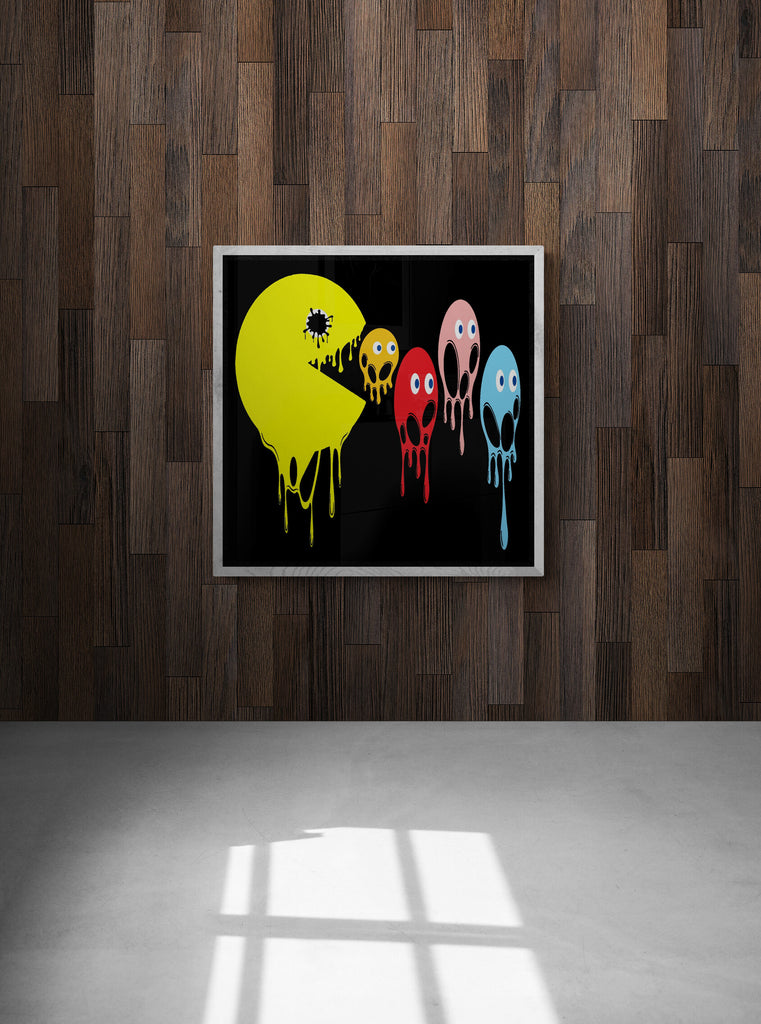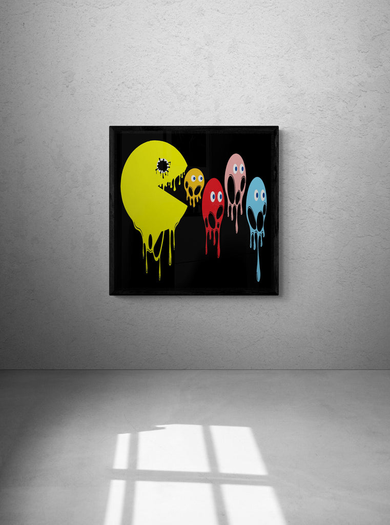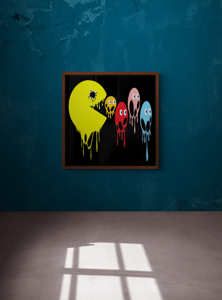 This graphic design art piece portrays a melting rendition of Pac-Man and the iconic ghosts from the classic arcade game. Pac-Man, in bright yellow, is melting, with drips running down the shape of its body, creating a fluid, liquid-like effect. The ghosts, typically red, pink, blue, and orange, are similarly depicted as melting, with their bodies and facial features appearing distorted and dripping downwards. The eyes of all the characters remain intact, adding a playful yet eerie contrast to their melting forms.