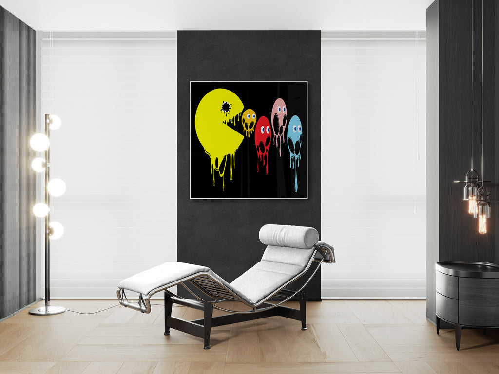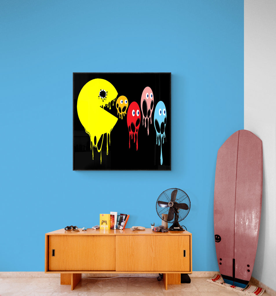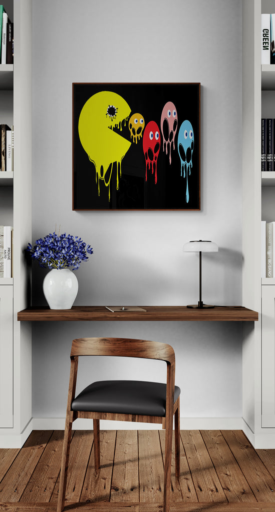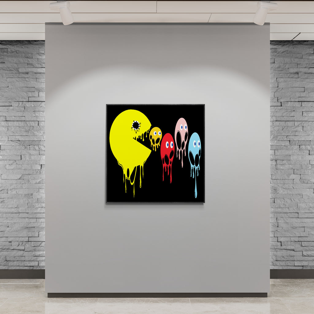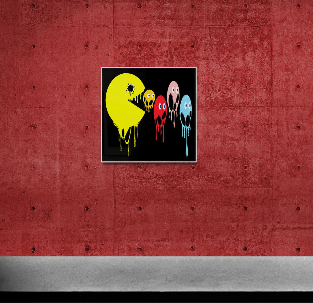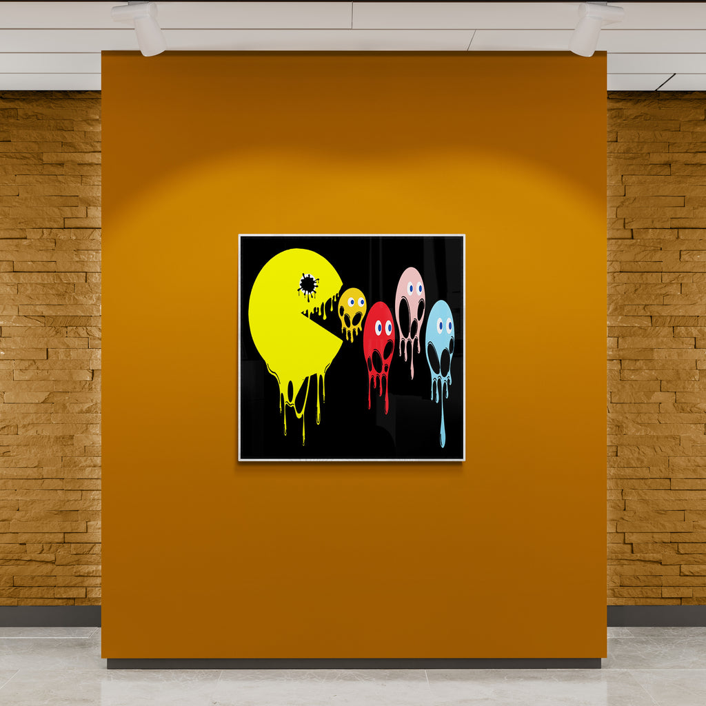 This graphic design art piece portrays a melting rendition of Pac-Man and the iconic ghosts from the classic arcade game. Pac-Man, in bright yellow, is melting, with drips running down the shape of its body, creating a fluid, liquid-like effect. The ghosts, typically red, pink, blue, and orange, are similarly depicted as melting, with their bodies and facial features appearing distorted and dripping downwards. The eyes of all the characters remain intact, adding a playful yet eerie contrast to their melting forms.