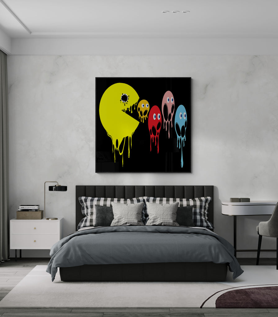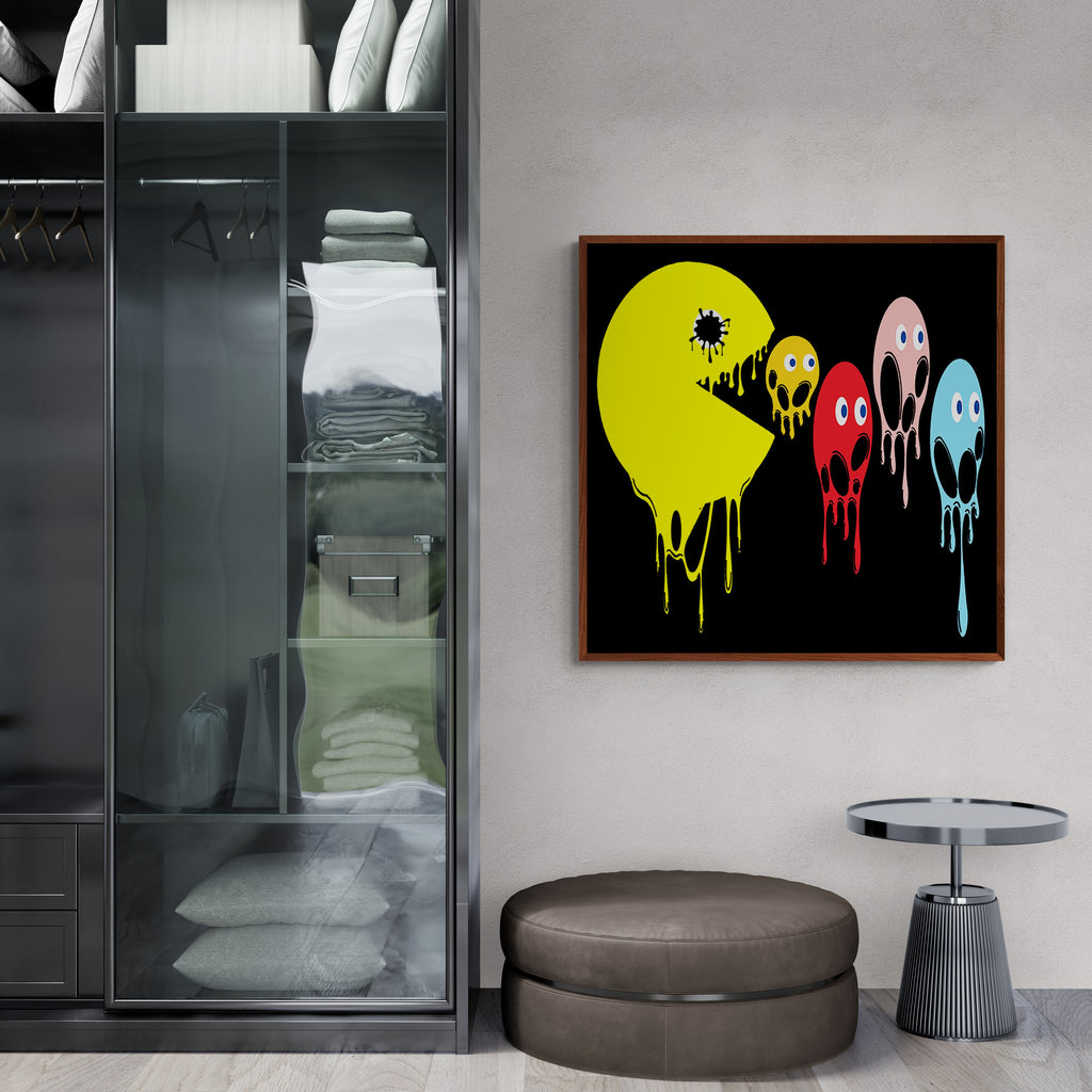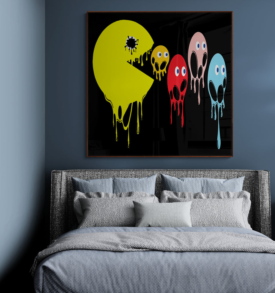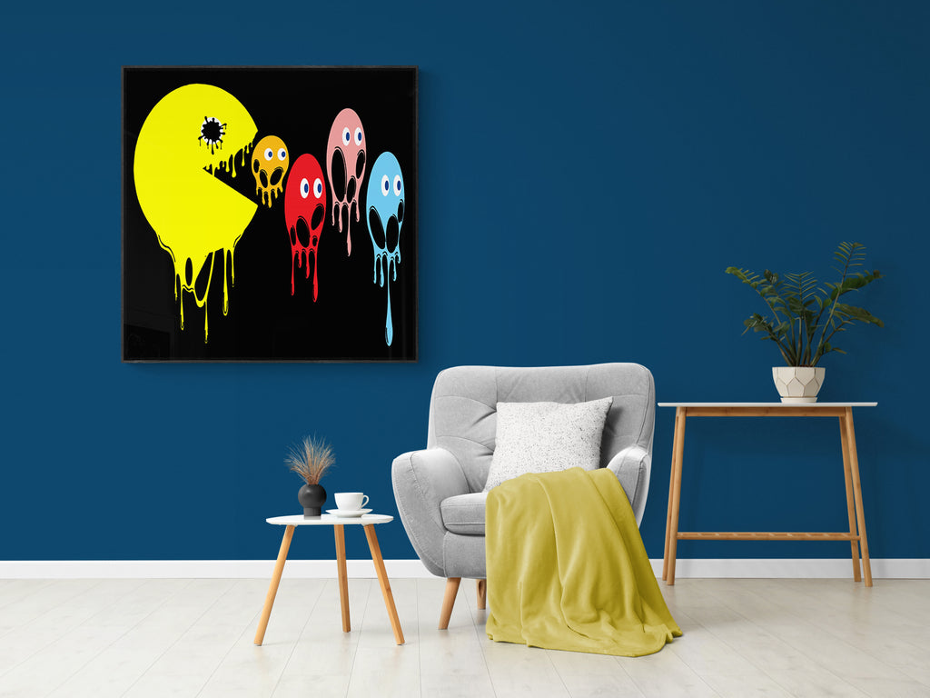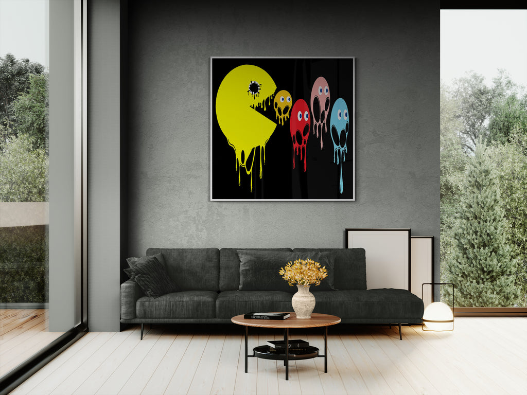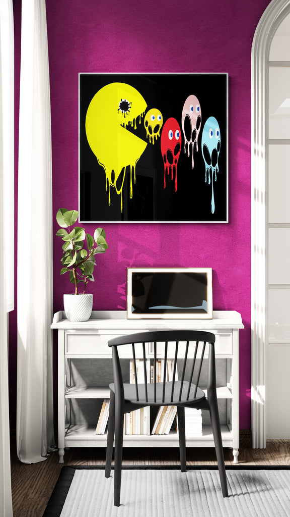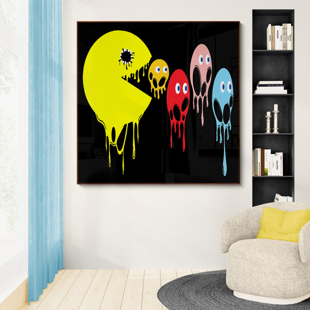 This graphic design art piece portrays a melting rendition of Pac-Man and the iconic ghosts from the classic arcade game. Pac-Man, in bright yellow, is melting, with drips running down the shape of its body, creating a fluid, liquid-like effect. The ghosts, typically red, pink, blue, and orange, are similarly depicted as melting, with their bodies and facial features appearing distorted and dripping downwards. The eyes of all the characters remain intact, adding a playful yet eerie contrast to their melting forms.