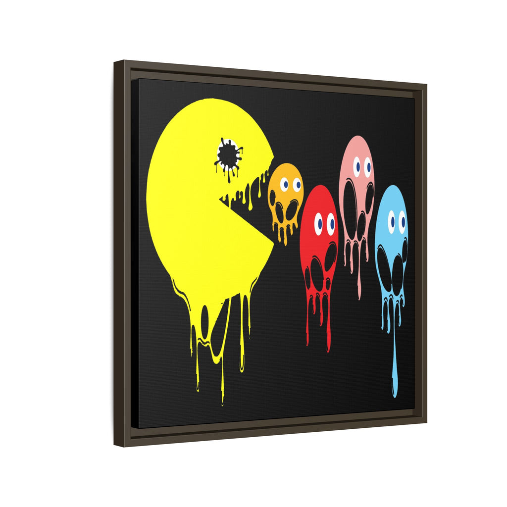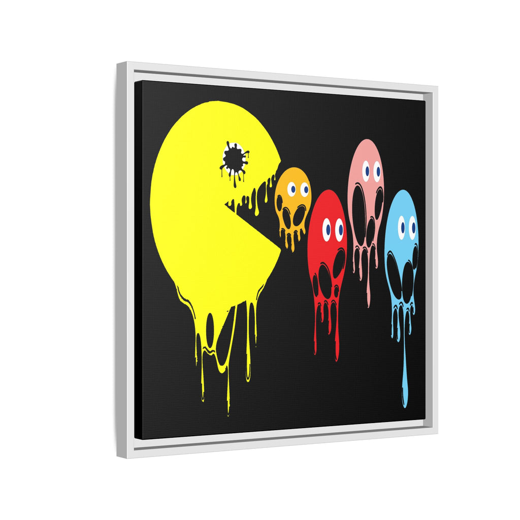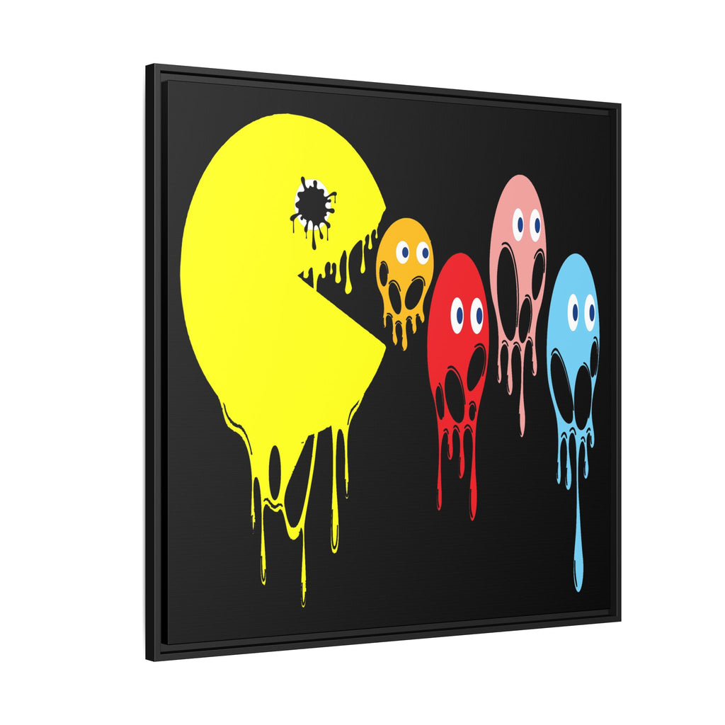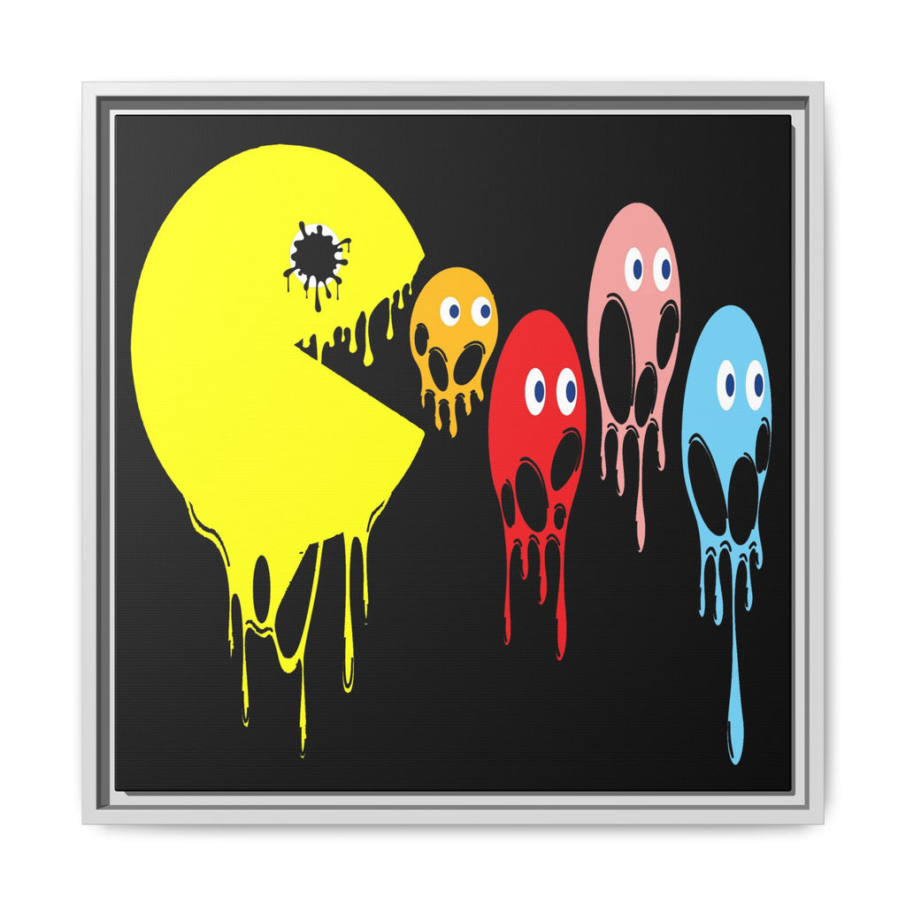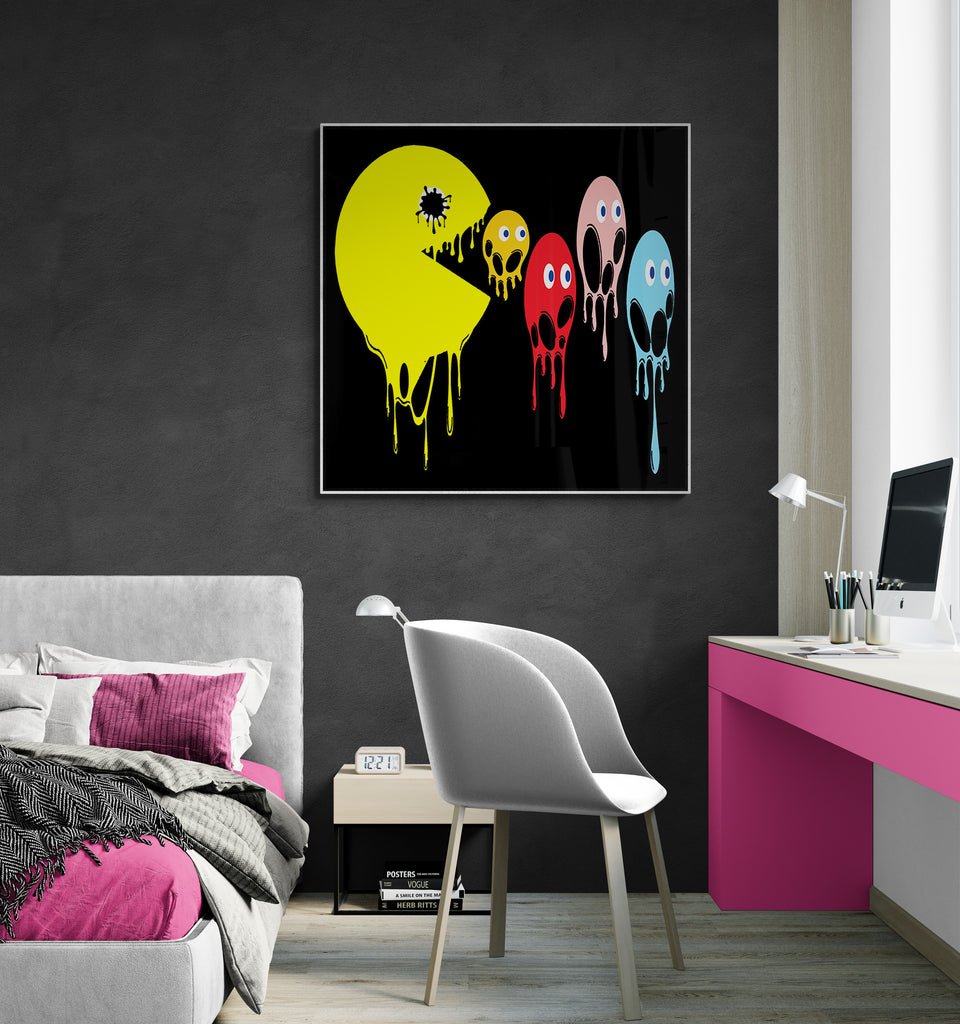 This graphic design art piece portrays a melting rendition of Pac-Man and the iconic ghosts from the classic arcade game. Pac-Man, in bright yellow, is melting, with drips running down the shape of its body, creating a fluid, liquid-like effect. The ghosts, typically red, pink, blue, and orange, are similarly depicted as melting, with their bodies and facial features appearing distorted and dripping downwards. The eyes of all the characters remain intact, adding a playful yet eerie contrast to their melting forms.