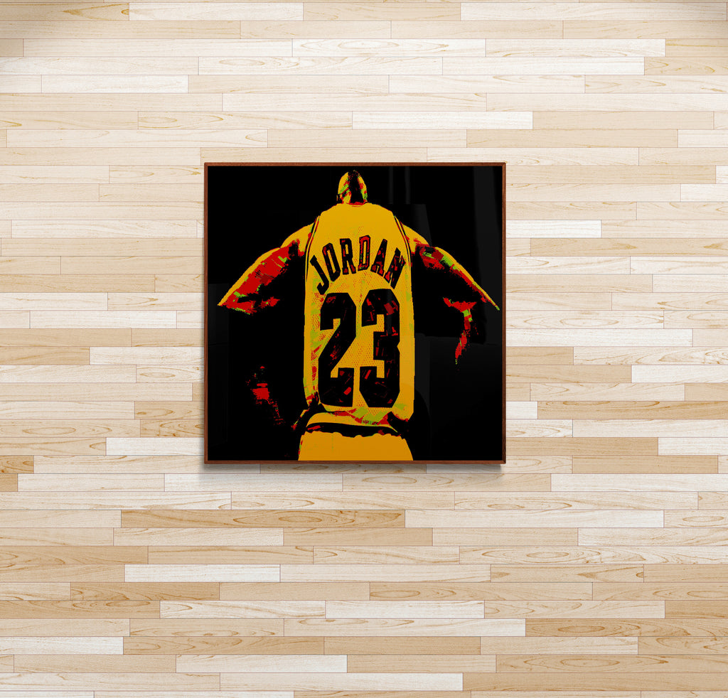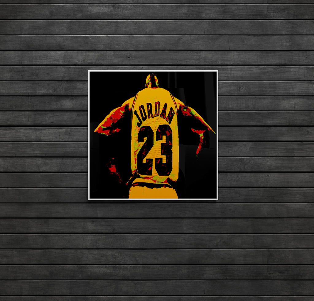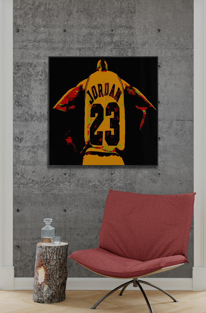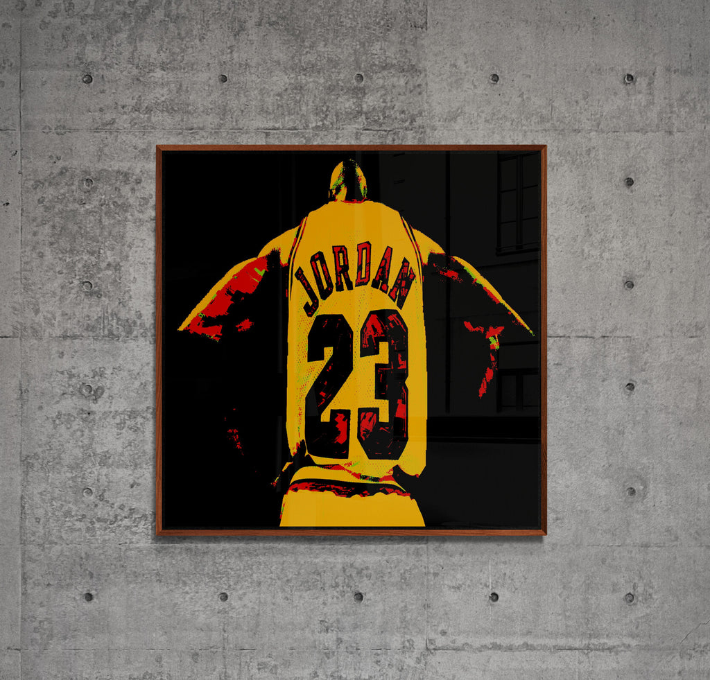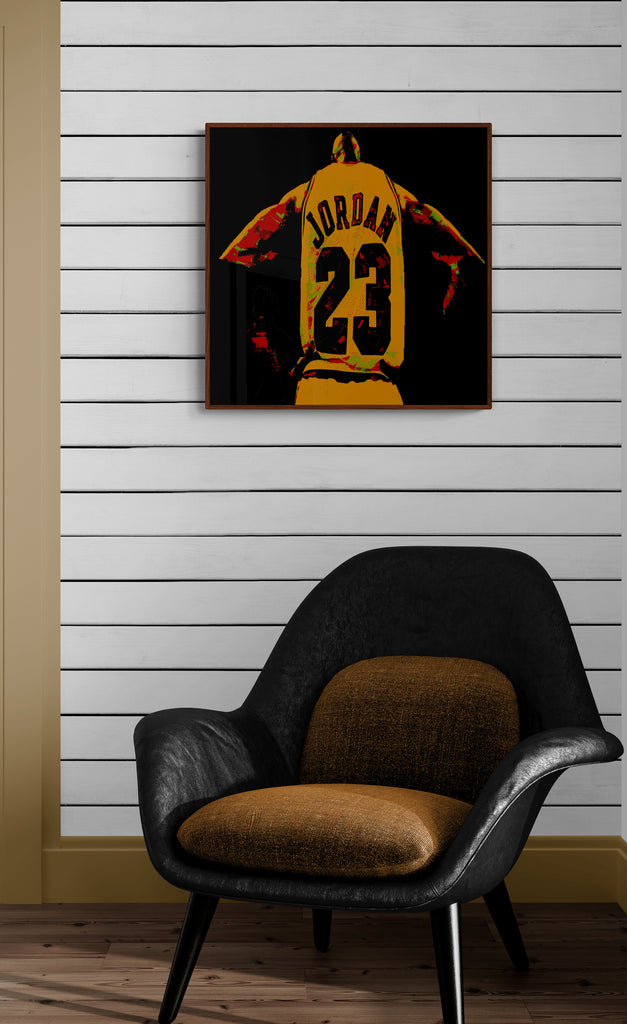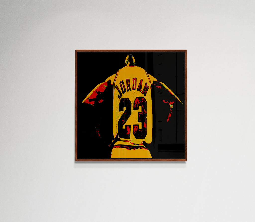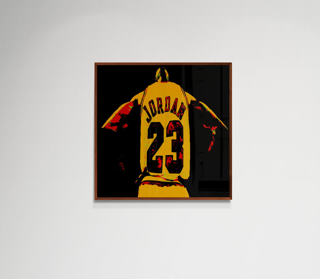 This striking graphic art design pays tribute to the legendary Michael Jordan, capturing his powerful stance from behind in bold, abstract tones. The iconic number 23 dominates the composition, symbolizing athletic excellence, determination, and enduring legacy. With its dynamic color treatment and sharp contrasts, Airborne Legacy is a visual celebration of greatness, perfectly blending sports history with contemporary artistic flair.