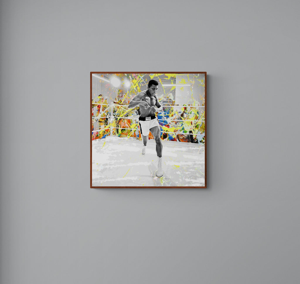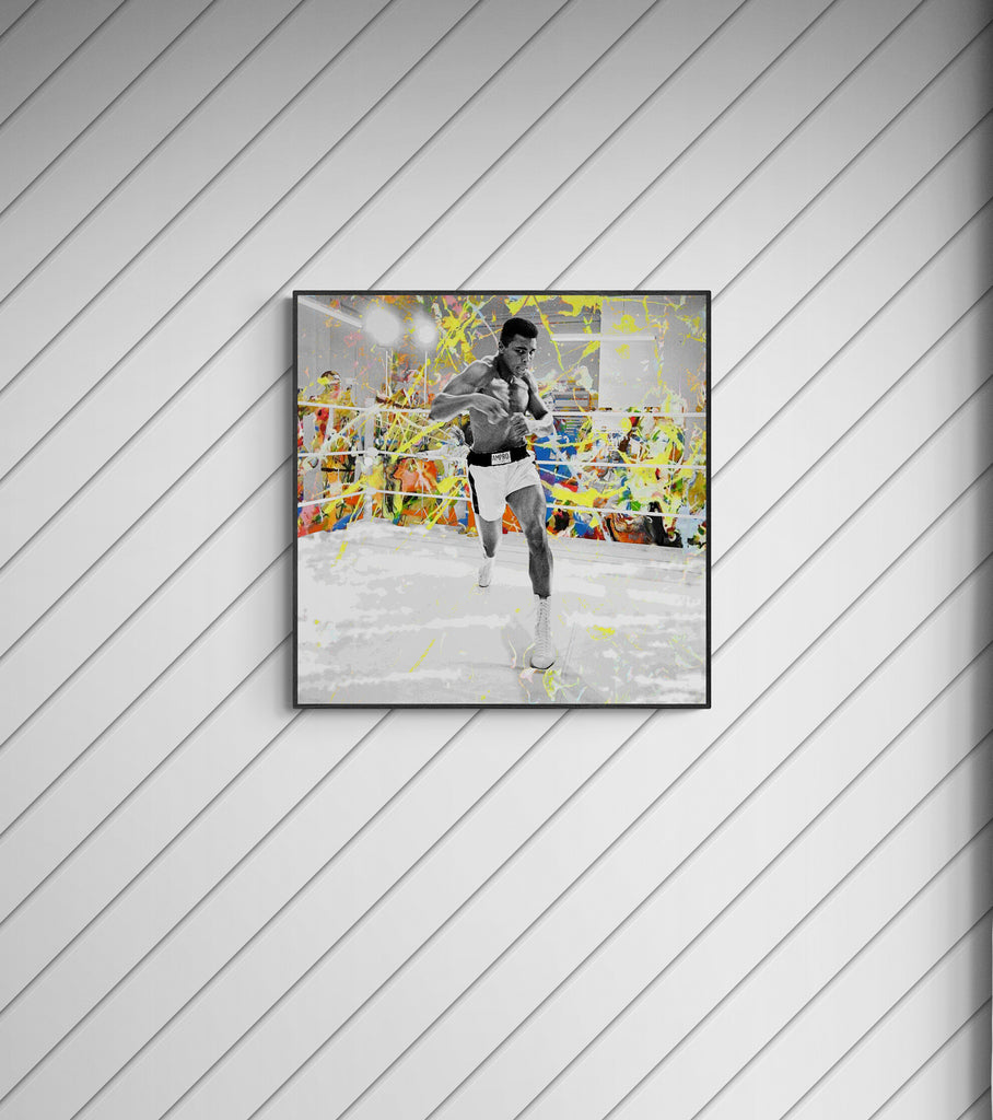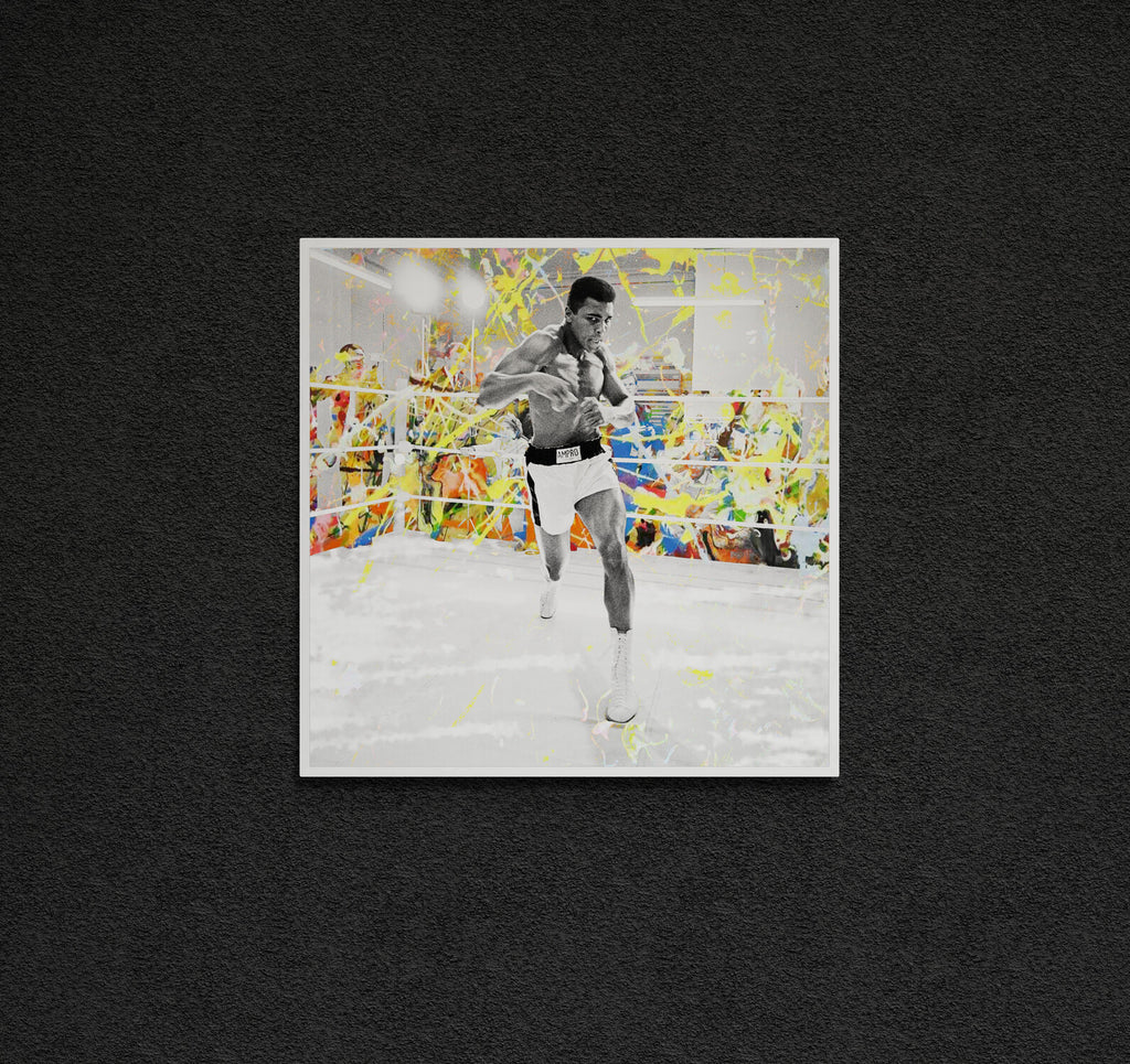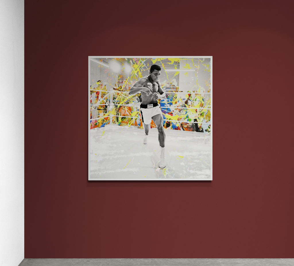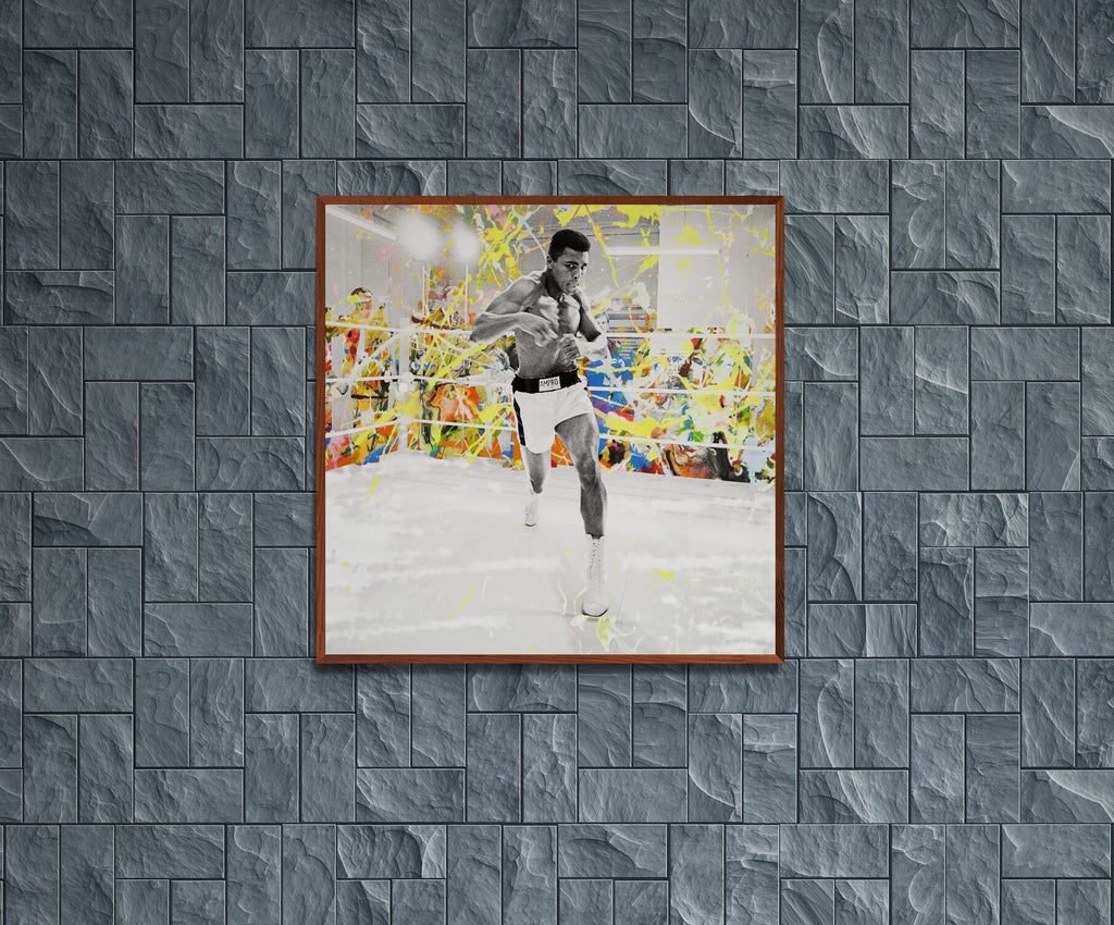 In this graphic design art piece, the legendary Muhammad Ali is depicted in striking black and white imagery against a backdrop of vibrant paint splashes. Ali's iconic profile boldly captures the power and grace of his legendary boxing career.