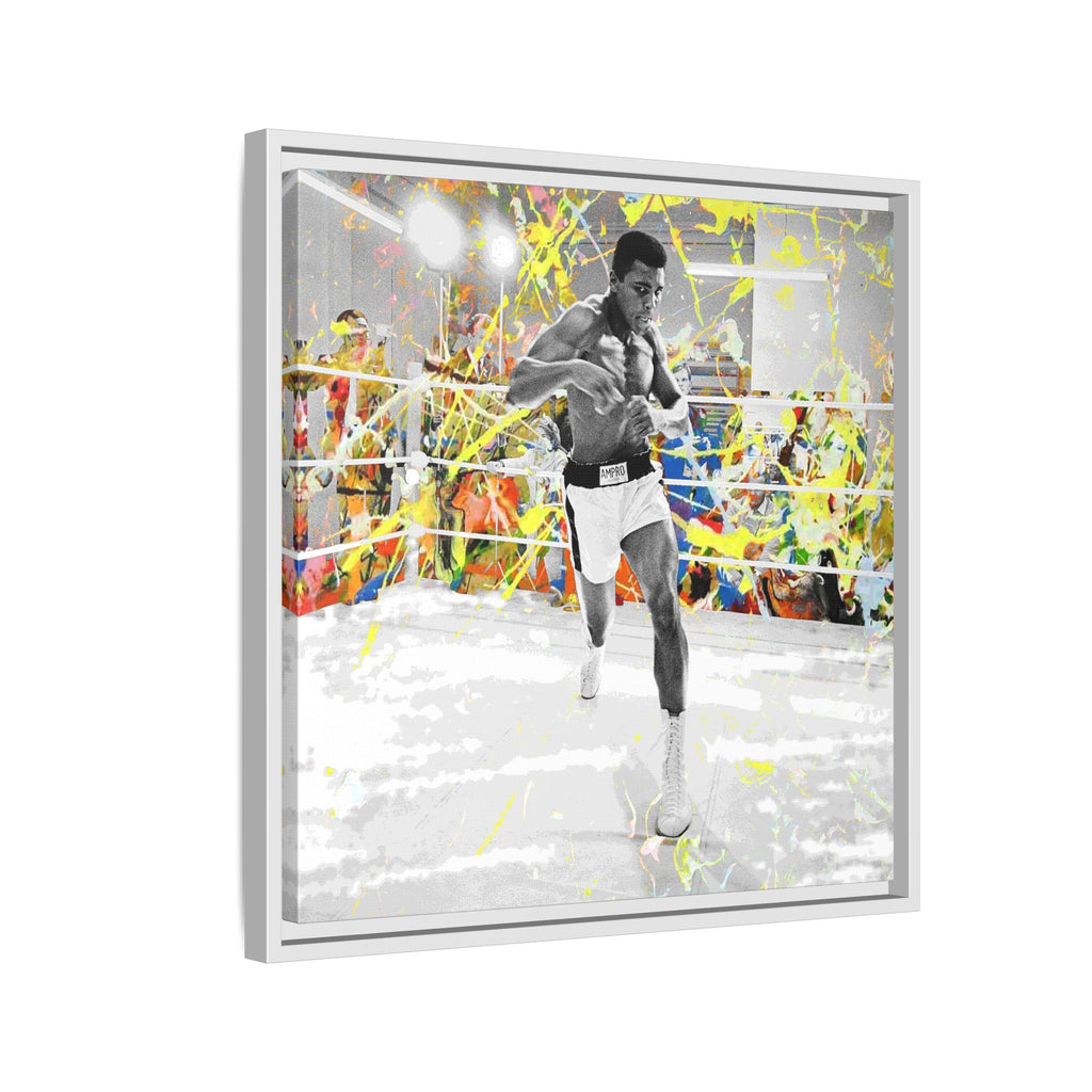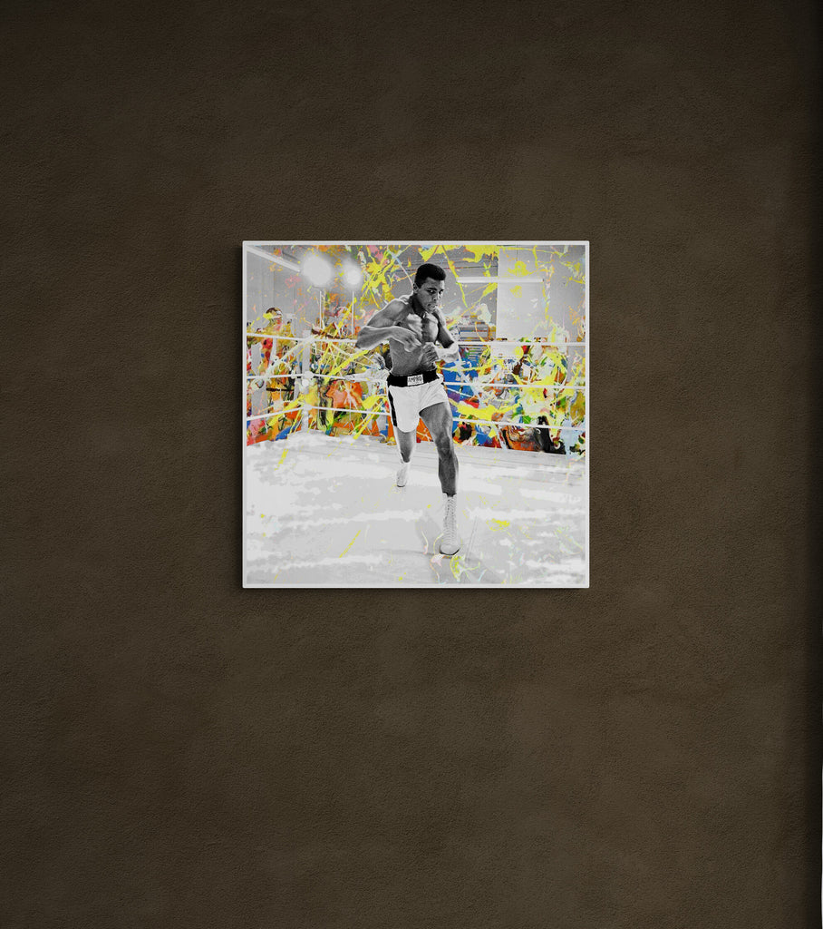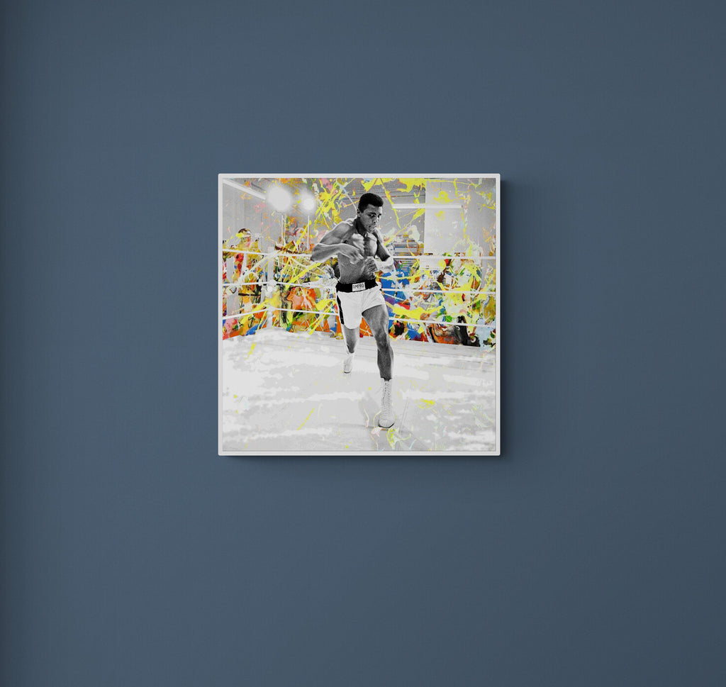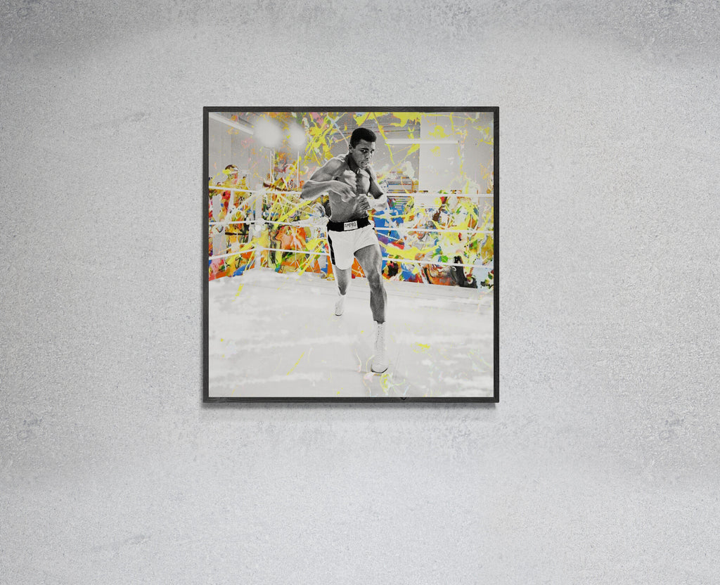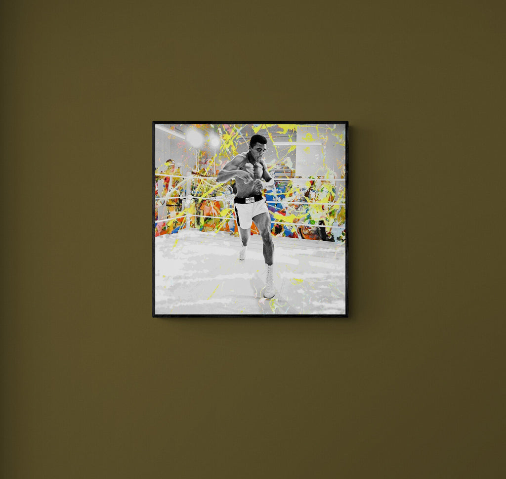 In this graphic design art piece, the legendary Muhammad Ali is depicted in striking black and white imagery against a backdrop of vibrant paint splashes. Ali's iconic profile boldly captures the power and grace of his legendary boxing career.