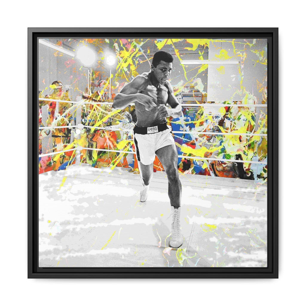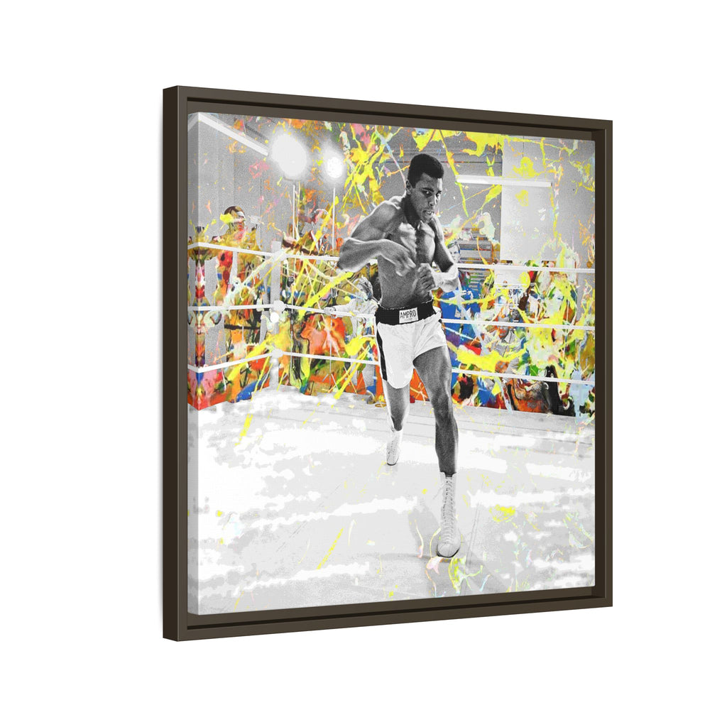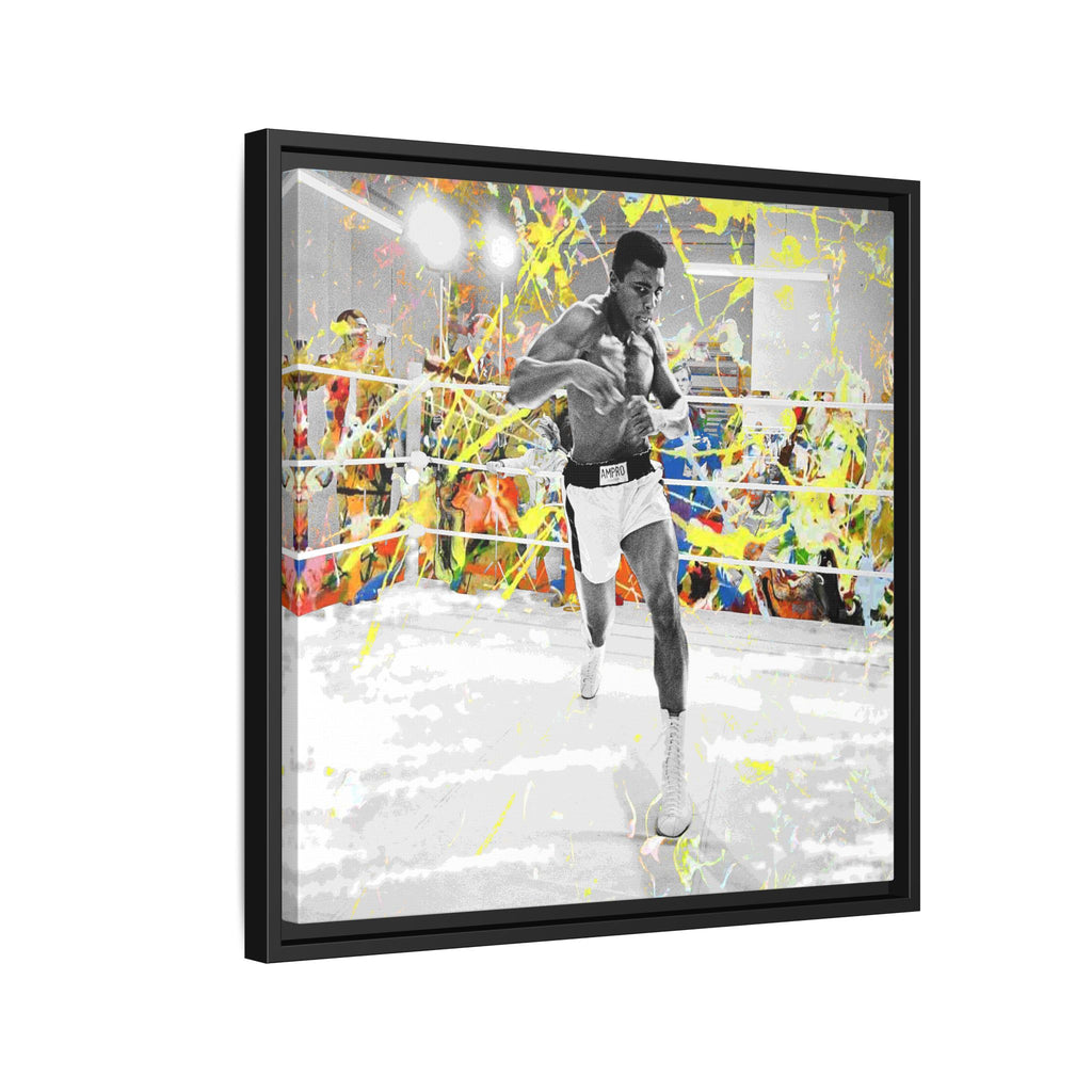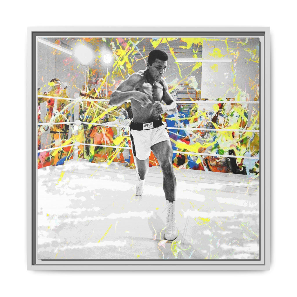 In this graphic design art piece, the legendary Muhammad Ali is depicted in striking black and white imagery against a backdrop of vibrant paint splashes. Ali's iconic profile boldly captures the power and grace of his legendary boxing career.
