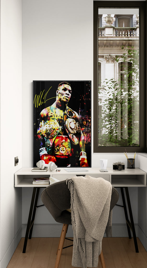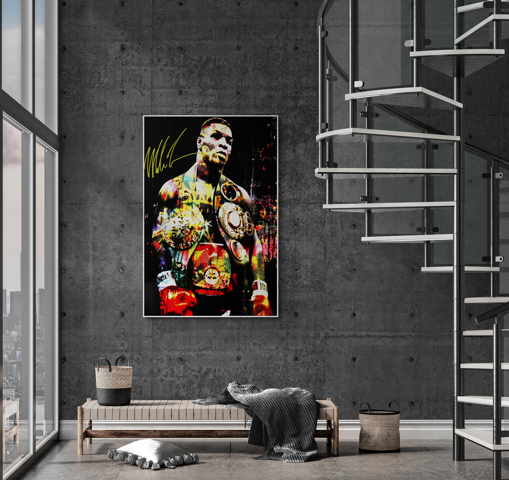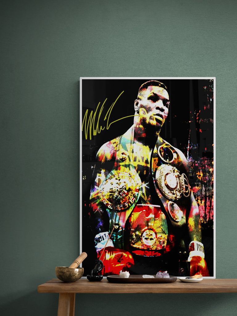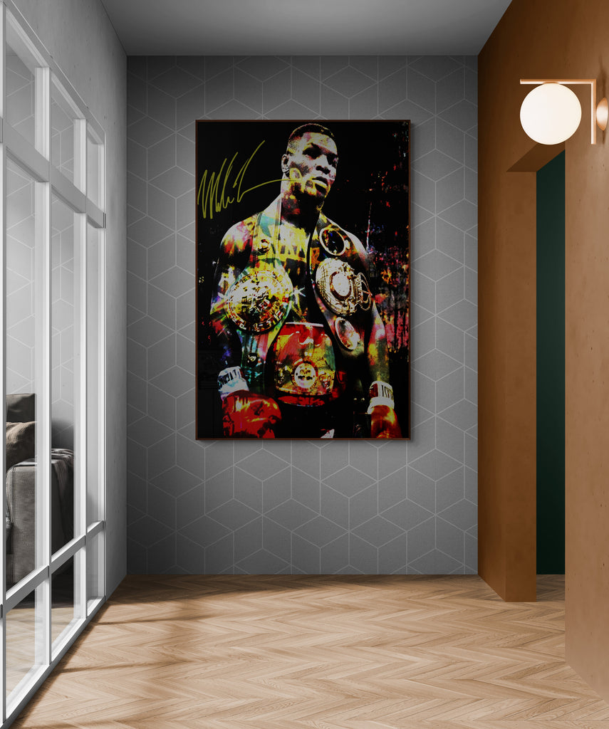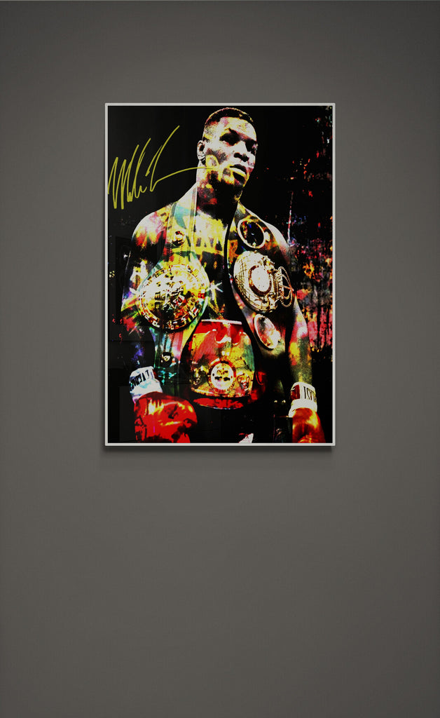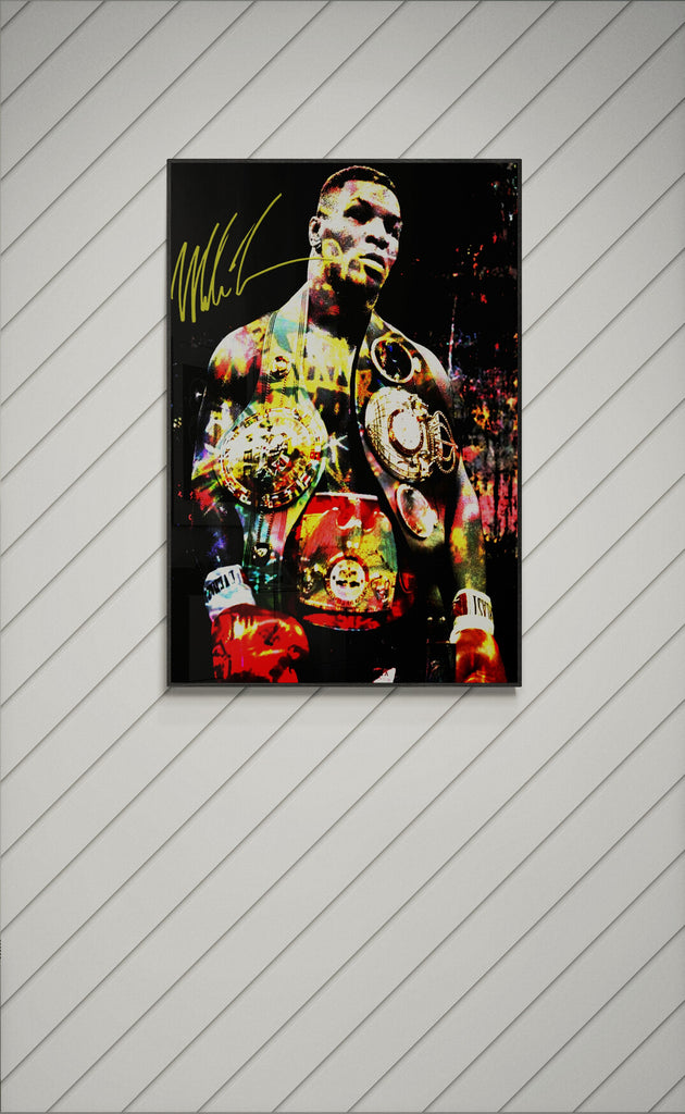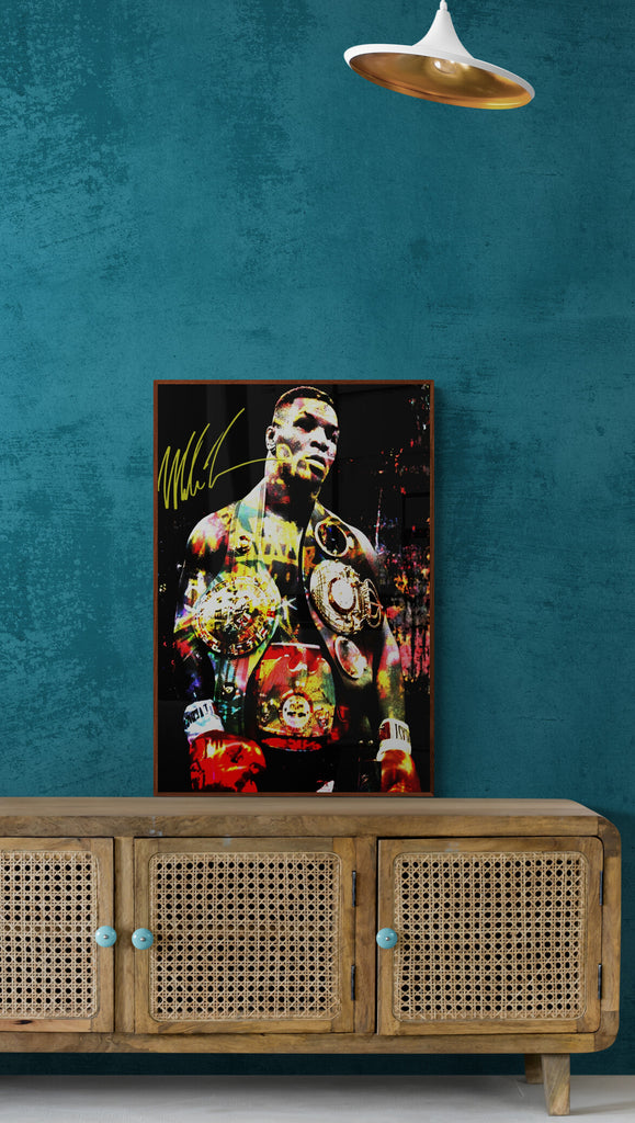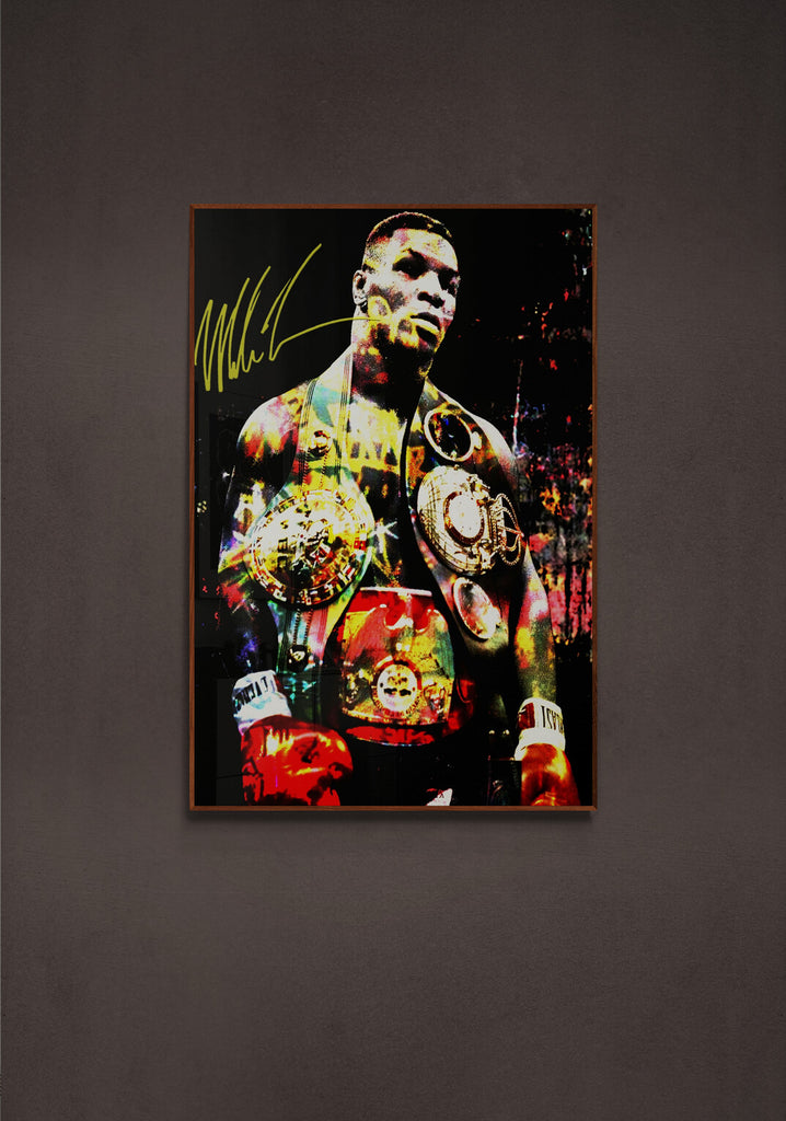 This explosive graphic art piece, Heart of Iron, captures the raw dominance and electrifying presence of a heavyweight legend. Bathed in bold color splashes and gleaming gold, the champion’s figure radiates intensity, power, and unshakable pride. Every detail—from the glint of the belts to the fury in his stance—echoes the relentless force of a fighter forged in fire and fame. A visual tribute to legacy, grit, and greatness.