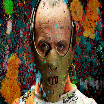 In this gritty and grungy graphic art design, the infamous Dr. Hannibal Lecter emerges from the shadows, his menacing presence palpable against a backdrop of dark and grimy colors. Dressed in his signature orange jumpsuit and restrained by a face mask, Lecter's chilling gaze pierces through the darkness, exuding an aura of calculated malevolence.