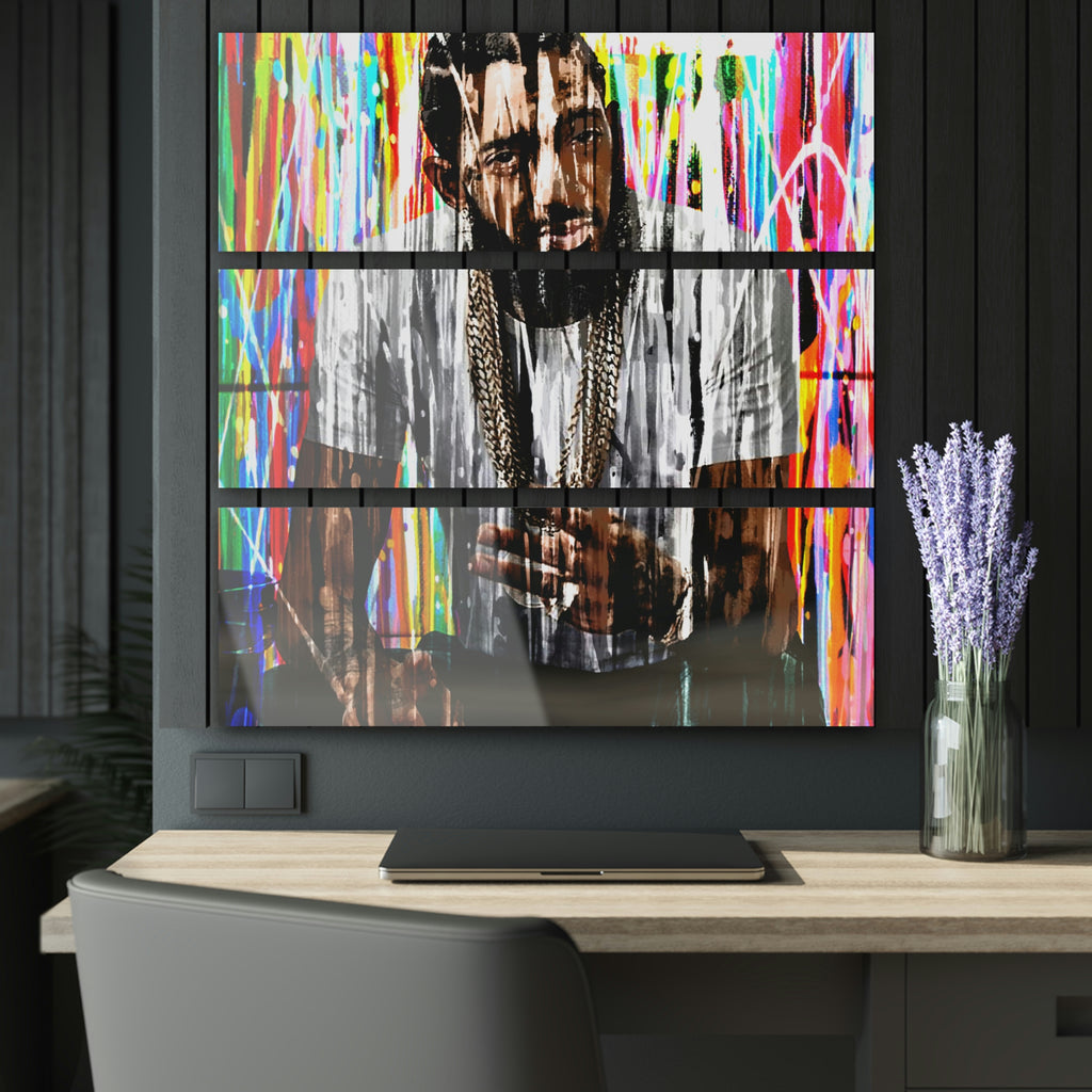 The horizontal three-panel acrylic display, with its vibrant and abstract depiction of Nipsey Hussle, serves as a powerful tribute to the rap legend. The use of bold, dynamic colors and abstract forms creates a visually stunning and emotionally resonant piece of art, capturing the essence of Nipsey Hussle's spirit and legacy.